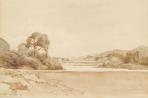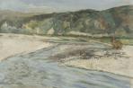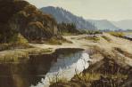 William Tiller was a draper's assistant at Wellington's Kirkcaldie and Stains department store. He was a neighbour of Nugent Welch in Wright Street, and in 1920 joined the independent Society of Seven artists and exhibited in their last two exhibitions. The eye moves from the painterly clump of grasses in the foreground across the deep expanse of beautifully coloured stones and water to the outline of hills against bright blue sky.