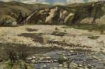 An overcast sky bleaches the colours of this popular Hutt River pool near the Silverstream Bridge where soldiers bathed since the Boer War years. Pumpkin Cottage was located behind the trees to the right. George Garnham (b.1877) was a buyer for the Government Printing Office in Wellington. In 1904 he became Secretary of the WellingtonSketching Club, successor to the Wellington Art Club.