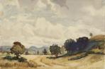 The Cosgroves' collection was appropriately the Expressions Art and Entertainment Centre's first exhibition when it opened in 2003. Their subsequent gift of 39 Pumpkin Cottage paintings in 2009 to be held forever on behalf of the people of Upper Hutt formed the basis of the gallery's permanent collection. This is Ernest Cosgrove's favourite painting. It sums up his passion for the New Zealand Impressionists' skill in depicting the colours of local skies. Nugent Welch captured the characteristically expansive Wairarapa landscape on a hazy day - imagine how rapidly he would have needed to paint to catch the moment before the central cloud floated away.