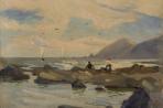 Mary (Molly) Tripe, nee Richardson (1870 - 1939) painted at Silverstream and Trentham for many years. But she had largely abandoned the area by the 1920s in favour of portraiture and extended trips overseas painting and exhibiting in England, France and Canada. The title of this sketchy image in Wellington Harbour near Red Rocks suggests it was exhibited overseas. It echoes Tripe's favourite themes of leisure and well-being, with slicks of red paint suggesting a turban worn by the fashionable woman in trousers. On returning from an overseas trip in 1928, Tripe was sufficiently alarmed at the state of Pumpkin Cottage to write about it and her memories of James Nairn, her former colleague at Wellington Technical School, in the new journal Art in New Zealand.