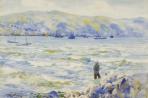 James (Jimmy) McLauchlan Nairn (1859 - 1904) often painted around Wellington Harbour. The fisherman calmly goes about his business near Roseneath, while the port bustles with shipping. A loaded vessel steams past other anchored ships waiting to dock, while two little sailing boats bob on the choppy sea. Nairn has captured Impressionist moments in characteristic blobs of pure colour for the viewer to mix visually.