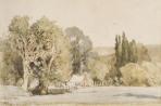 Nugent Welch (1881 - 1970), served overseas and was appointed official New Zealand war artist in 1918. Charged with recording post-war horrors and destruction in allied France, he returned as a hero to Wellington in 1919 and resumed painting in the idyllic surroundings of Silverstream. Welch was immortalised as the bohemian artist at Pumpkin Cottage in Nelle Scanlan's best-selling 1934 romantic novel Winds of Heaven set in Upper Hutt. The bright colours and loosely worked, painterly technique suggest this watercolour dates to the mid-1930s. Further research may reveal whether or not this is a rear view of the famous cottage. The large tree that asymmetrically intersects the space illustrates a characteristic Impressionist technique of selecting an unusual and seemingly arbitrary view.