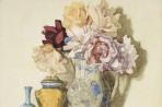 In between painting excursions to Taranaki, Marlborough and Mt. Cook, Dolla Richmond developed her magnificent flower paintings, which she usually painted at her Hill Street studio in Wellington or her home at York Bay. The bright yellow jar with a snake handles may have been part of her Italian majolica pottery tea set. Renowned for her handling of watercolour, Richmond's Impressionistic techniques include leaving areas of bright white paper exposed as highlights and the wet-on-wet method of layering colour to achieve deep saturated yellows and reds.